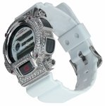This custom iced out genuine G-Shock features the Z-Shock Mogul Series of Bezels. They are are a must for the person where details are important. The Mogul Series of Z-Shock Bezels are custom made and iced out with your choice of Ziamond Cubic Zirconia or genuine Diamonds. They can be ordered in Z-Shock's specialty Sterling Silver alloy with Platinum finish, Solid 14K white or Yellow gold and the Mogul Series can even be made in luxurious Platinum, all with OEM precision and a factory fit. Don't be fooled by other blinged out G-Shocks, many are made by hobbyists or one time atteptors. Z-Shock is the originator of the factory fit and provide a bezel that fits over the G-Shock in a professional manner. No rig jobs here.